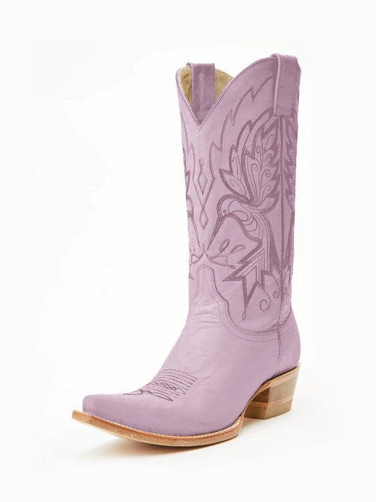 Каубойски ботуши до средата на прасеца с бродерия от лавандулови къси пръсти и ярки птици