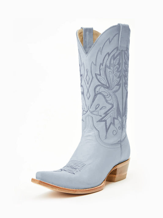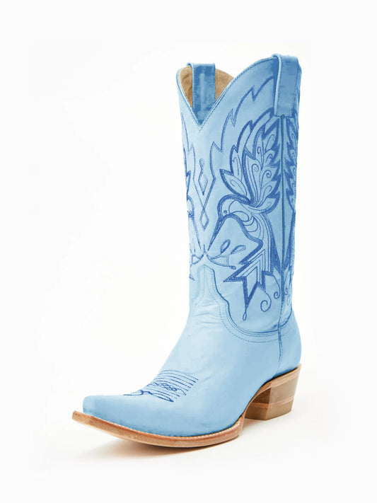 Сини каубойски ботуши с бродерия от птици и къси пръсти до средата на прасеца
