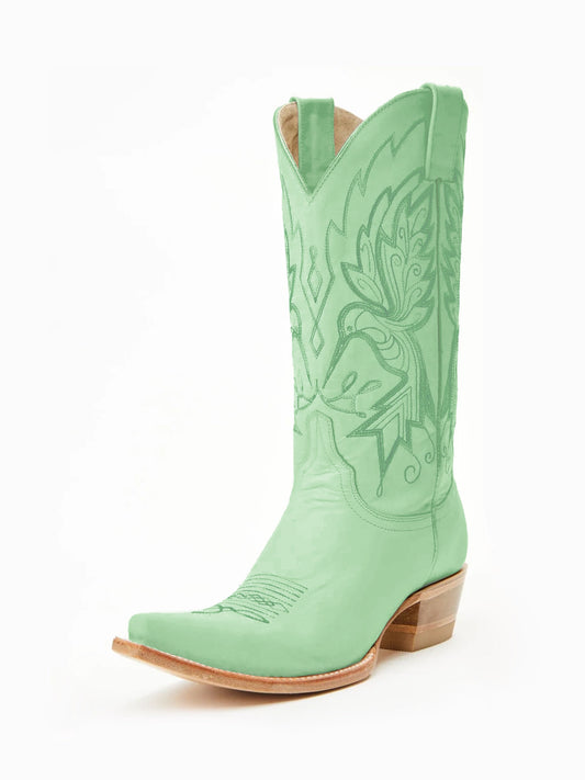 Светлозелени каубойски ботуши с бродерия от птици и къси пръсти до средата на прасеца