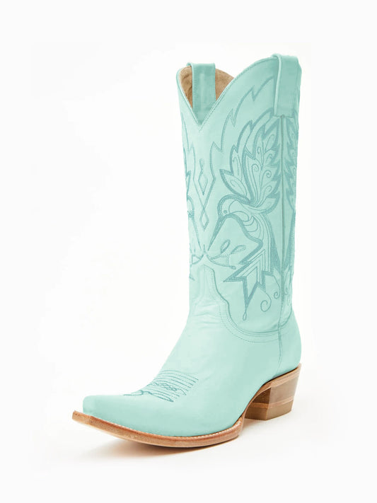 Светлоцианови каубойски ботуши с къси пръсти и бродерия с ярки птици до средата на прасеца