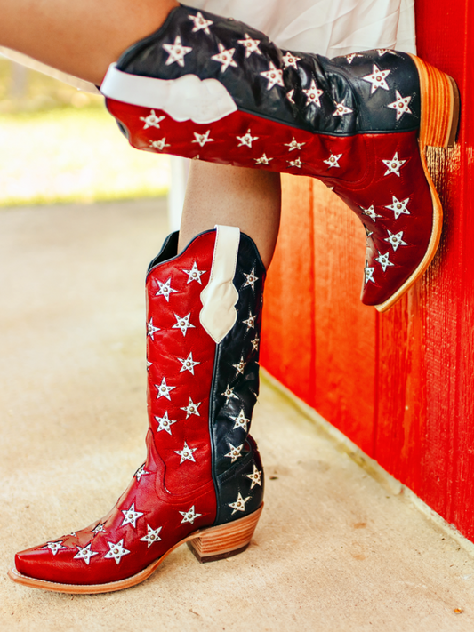 Контрастни червени и сини ботуши с къси пръсти и каубойски ботуши до средата на прасеца с инкрустация от звезди