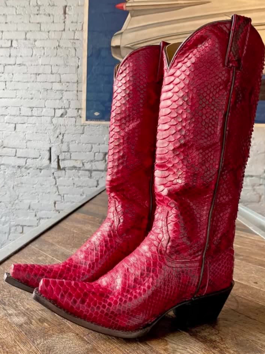 Каубойски ботуши до коляното от червена змийска кожа с къси пръсти и широки прасци