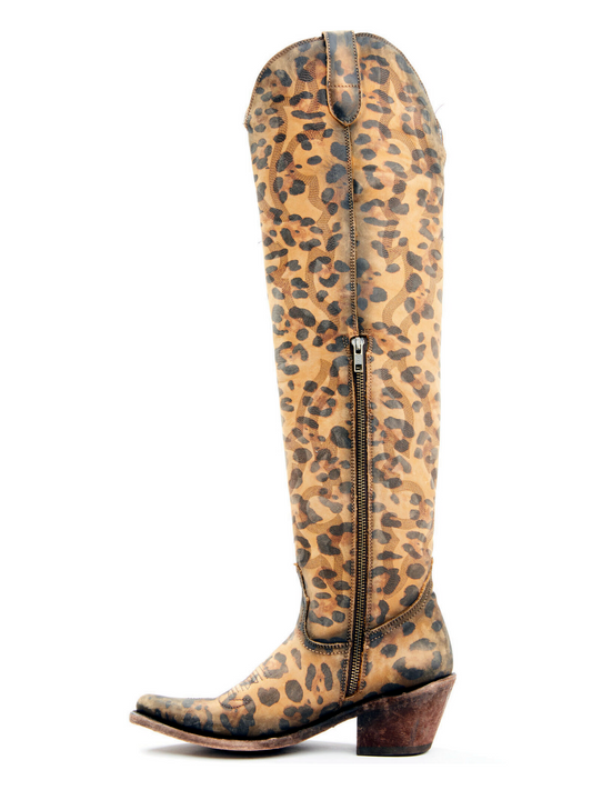 Каубойски ботуши над коляното с леопардови, бадемови пръсти, бродерия и половин цип