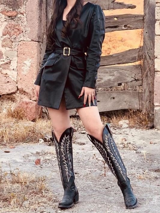 Каубойски ботуши над коляното с бродерия Arrows и къси пръсти - черни