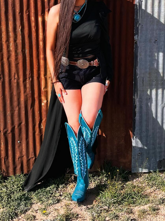 Каубойски ботуши над коляното с бродерия Arrows и къси пръсти - тюркоазени