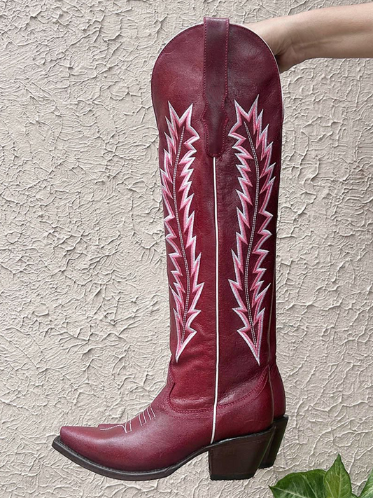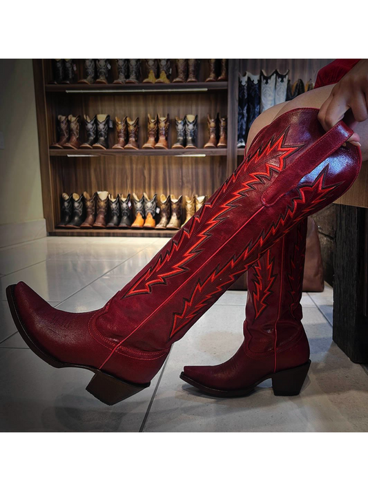 Каубойски ботуши над коляното с бродерия Arrows и къси пръсти - червени