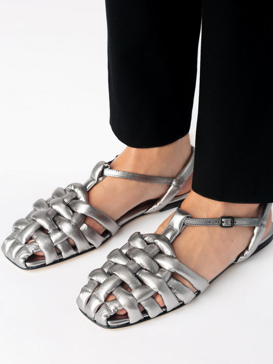 Сандали с подплатена каишка, преплетени с квадратен връх и Т-образна каишка на глезена, металически сребърни