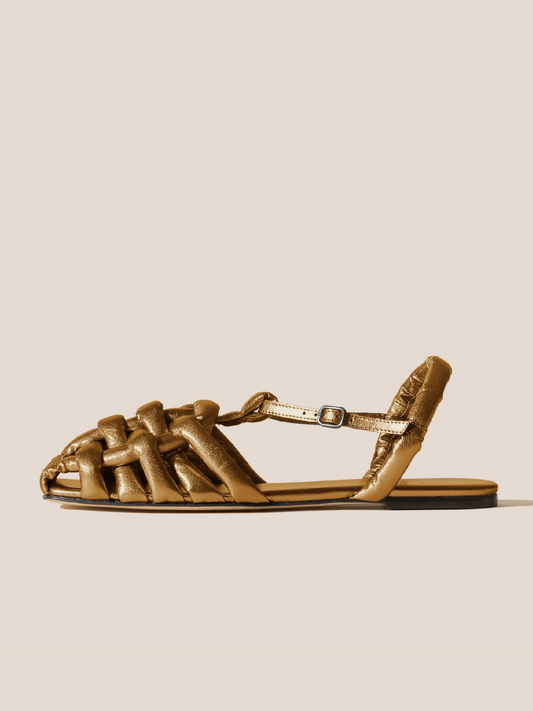 Сандали с металически златисти подплатени каишки, преплетени с квадратни пръсти и Т-образна каишка на глезена