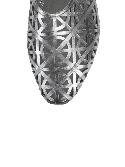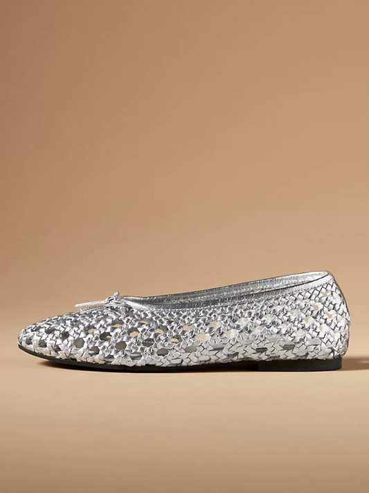 Металически сребърни бохо плетени балетки с издълбани крачоли и изящна панделка