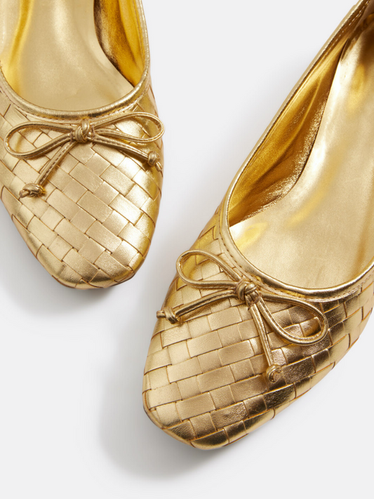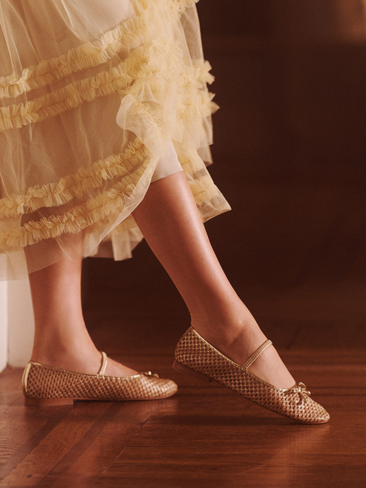 Металически златни балетки с плетена панделка от рафия, заоблен връх, бохо, Мери Джейн