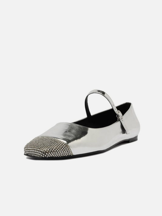 Металически сребърни бляскави обувки Mary Jane с квадратни пръсти и кристали