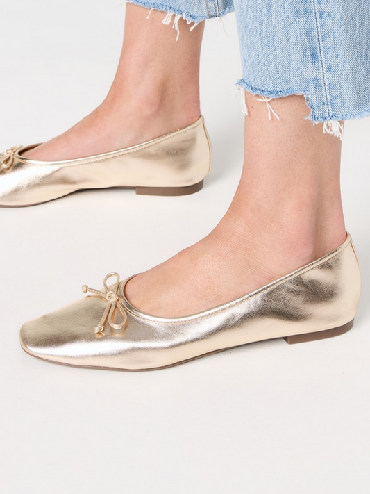 Балетки с металически златист цвят и квадратни пръсти с панделка