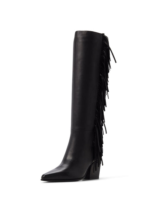 Black Snip-Toe Side Fringe Half-Zip Simple Knee High Cowgirl Boots