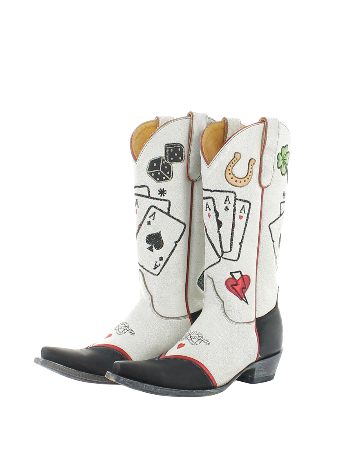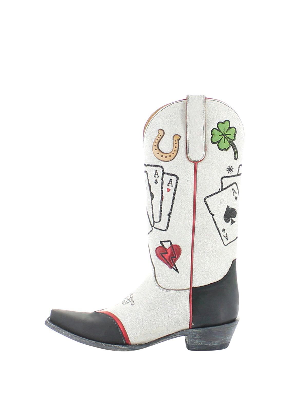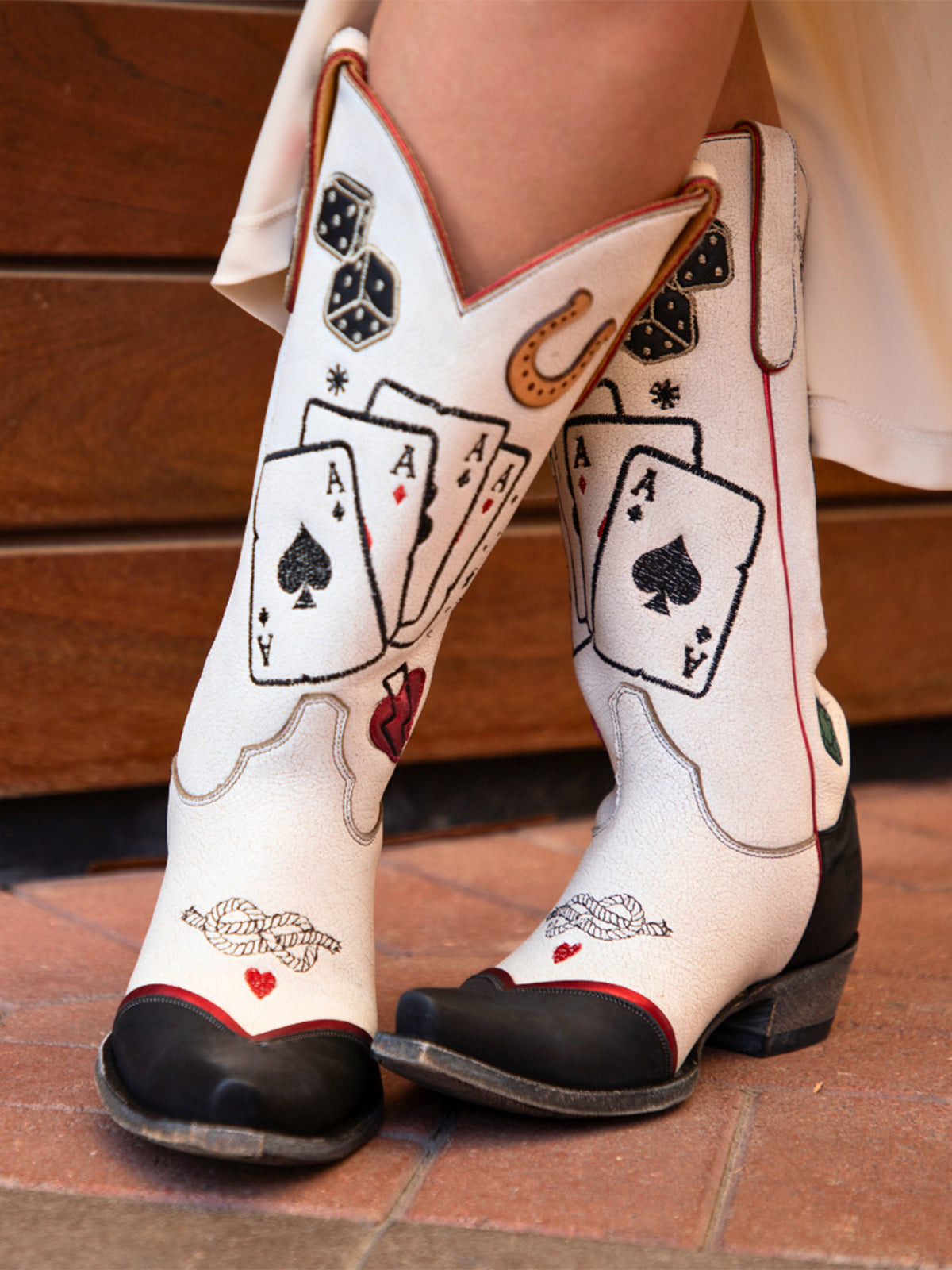 Тези ботуши играят със смел контраст – свежо черно и бяло, разделени като маса за карти в полунощ – докато бродерията на карти и апликацията на подкова създават история за късмет, случайност и западна суровост. Късият връх изостря профила, а височината до средата на прасеца добавя поразителен баланс. Проектирани с отношение и въображение, те придават игрив оттенък на класическия каубойски стил.