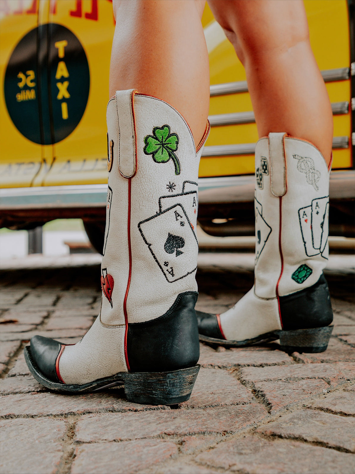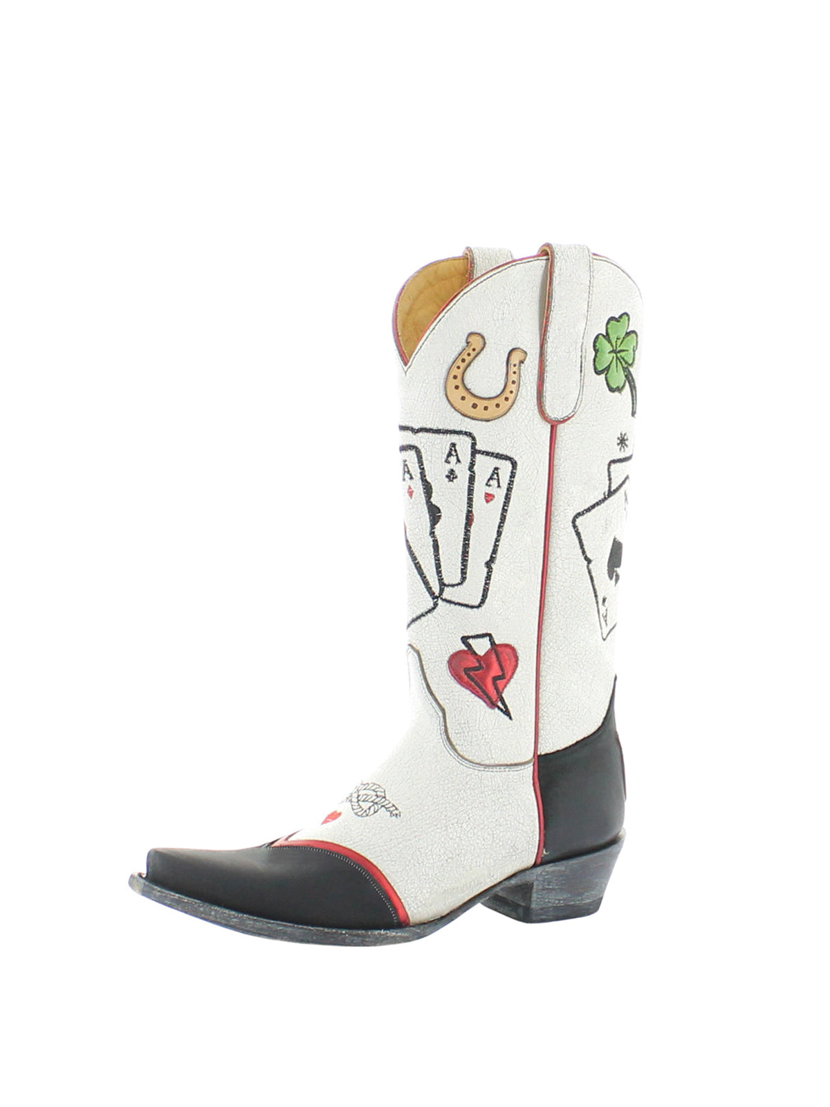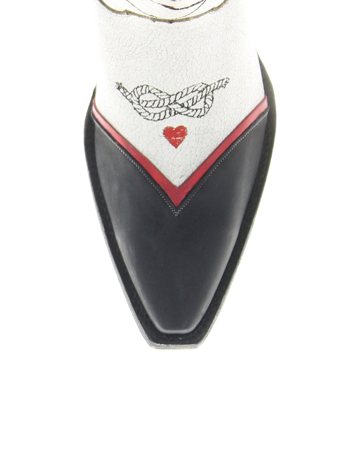 Тези ботуши играят със смел контраст – свежо черно и бяло, разделени като маса за карти в полунощ – докато бродерията на карти и апликацията на подкова създават история за късмет, случайност и западна суровост. Късият връх изостря профила, а височината до средата на прасеца добавя поразителен баланс. Проектирани с отношение и въображение, те придават игрив оттенък на класическия каубойски стил.