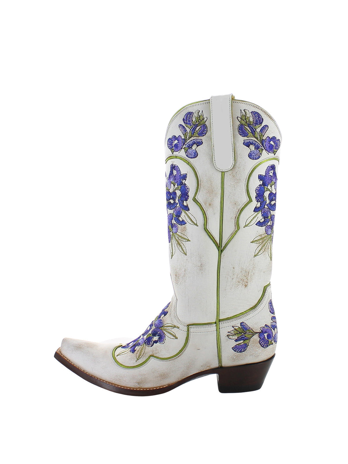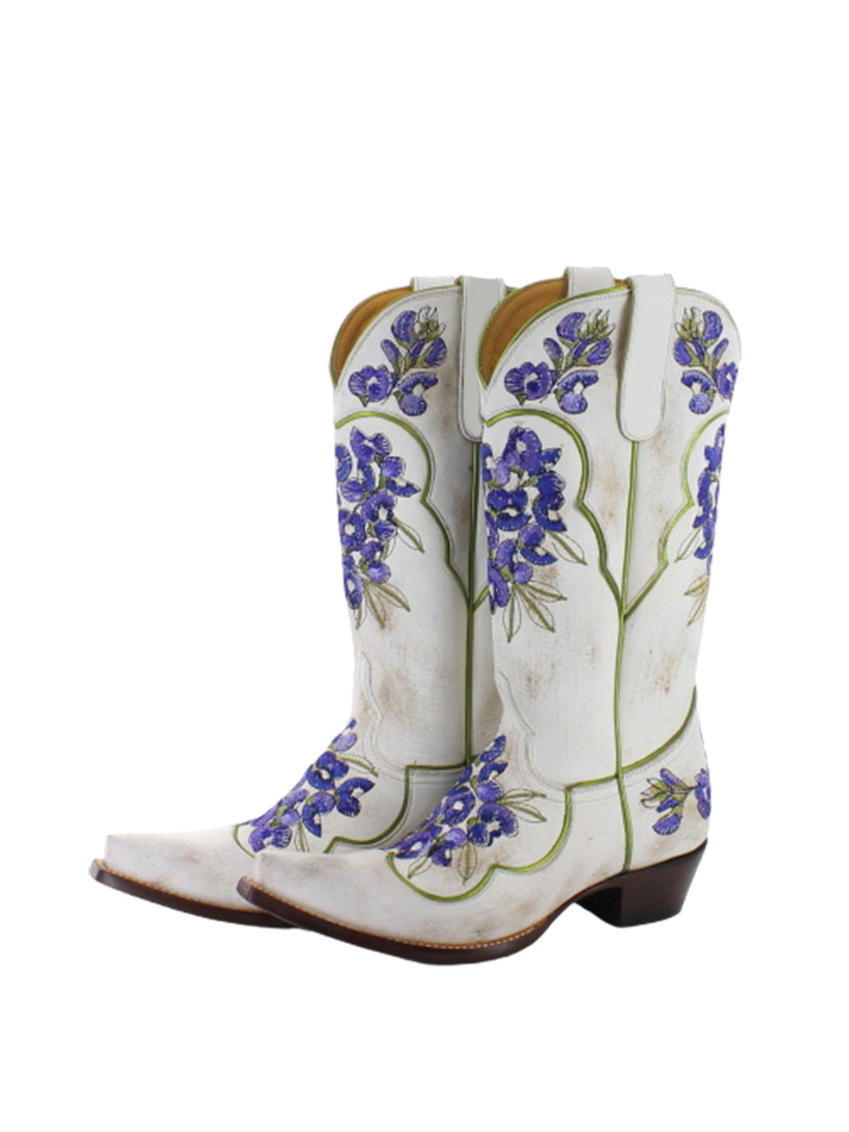 Тези ботуши съчетават изветрял завършек с разцъфнала синя флорална бродерия, създавайки визия, която е едновременно романтична и сурова. Късият връх изостря силуета, а износената текстура добавя усещане за вече преживени истории. Нежни на цвят, но смели на индивидуалност, те внасят мек западен чар във всяка крачка.