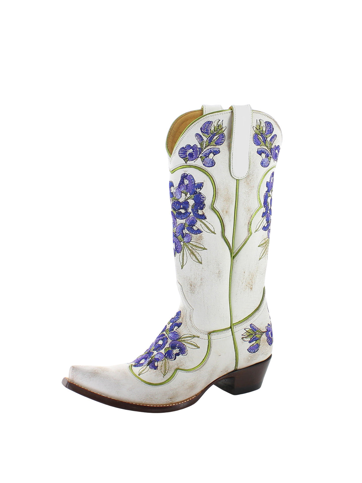 Каубойски ботуши до средата на прасеца с бродерия и сини цветя в цвят слонова кост с къси пръсти