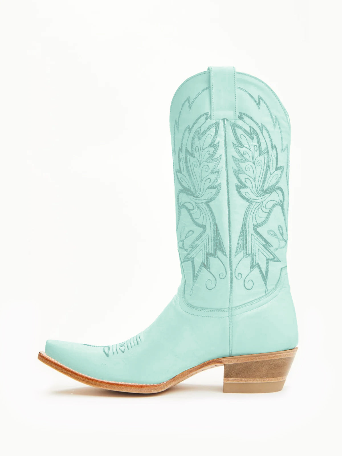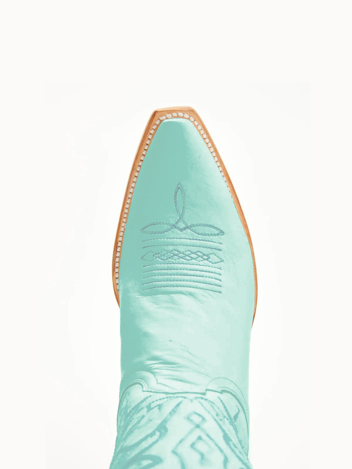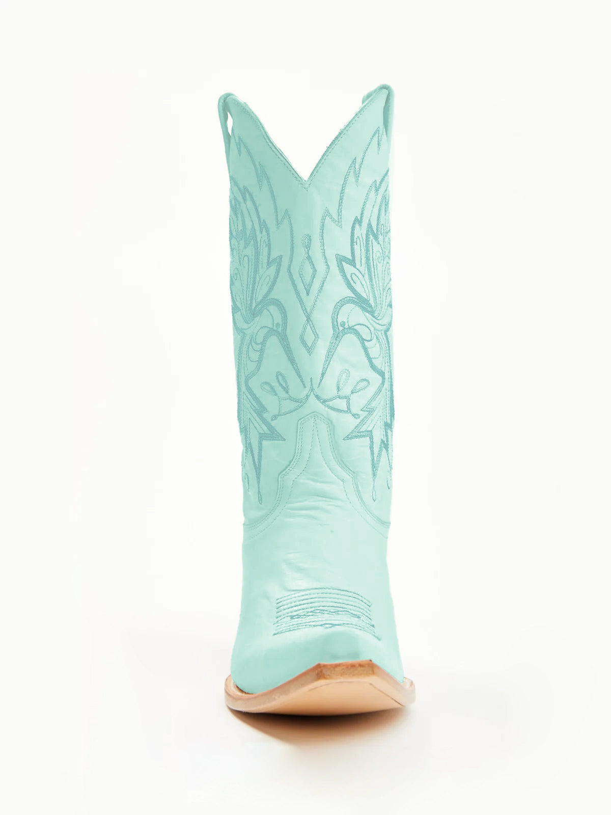 Светлоцианови каубойски ботуши с къси пръсти и бродерия с ярки птици до средата на прасеца