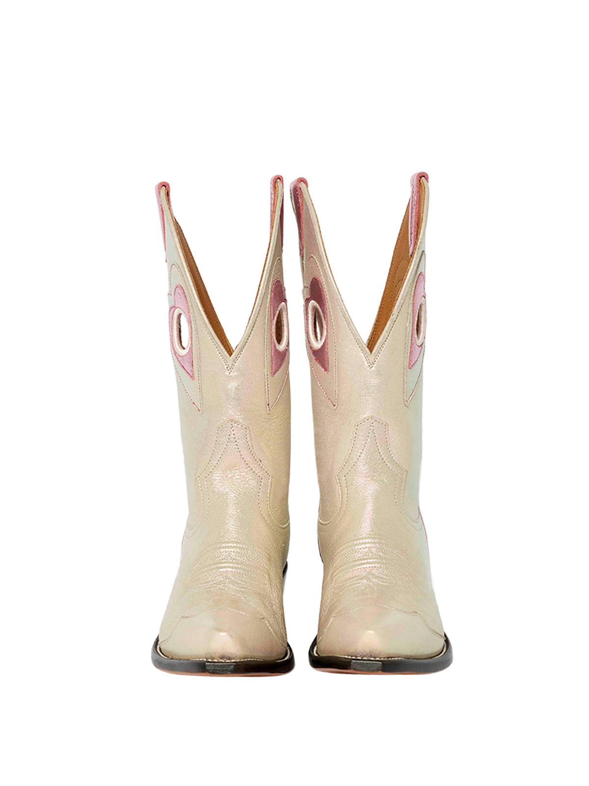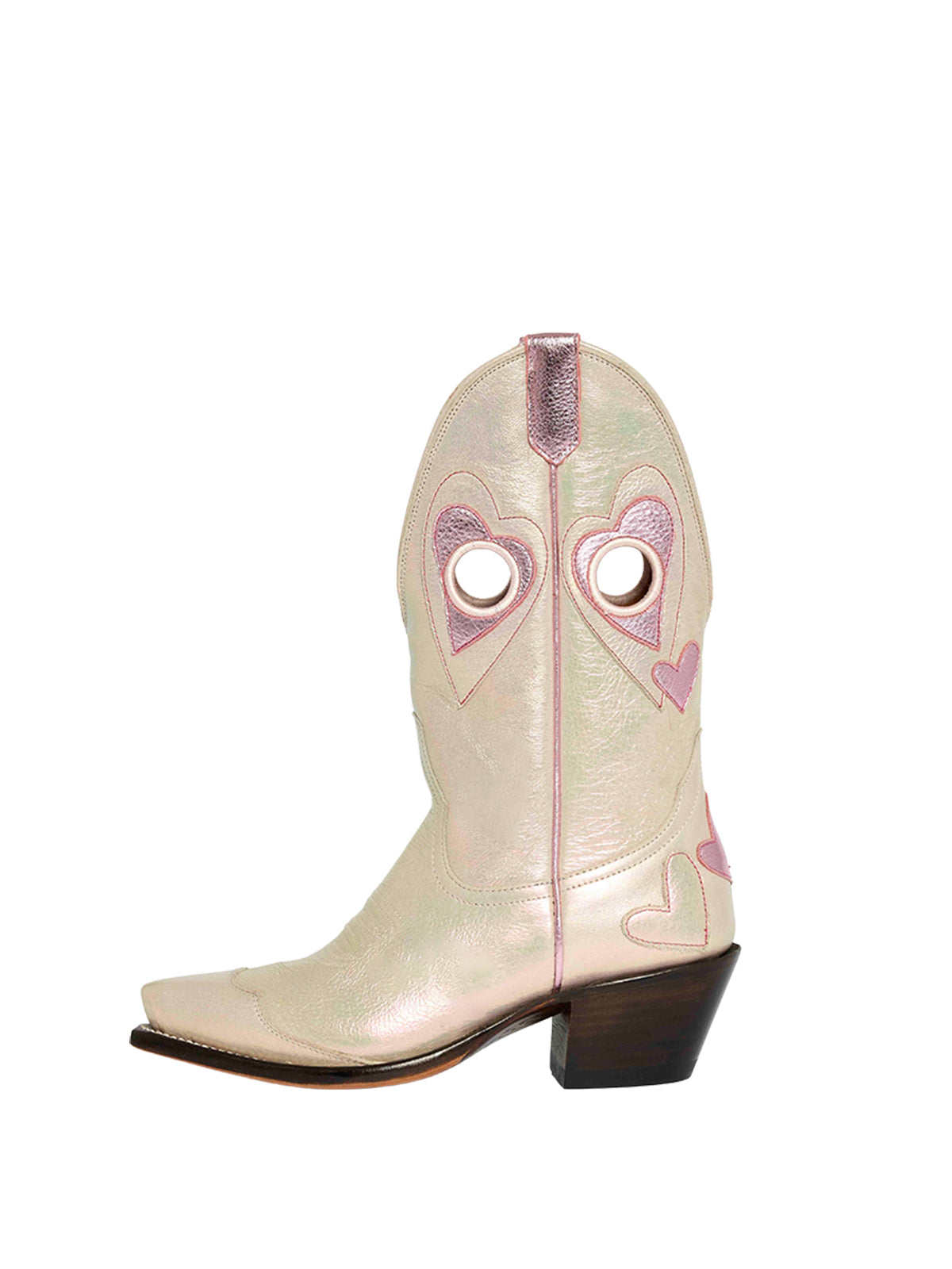 Металически светлорозови каубойски ботуши с къси пръсти и апликация с цветни сърца, изрязани до средата на прасеца