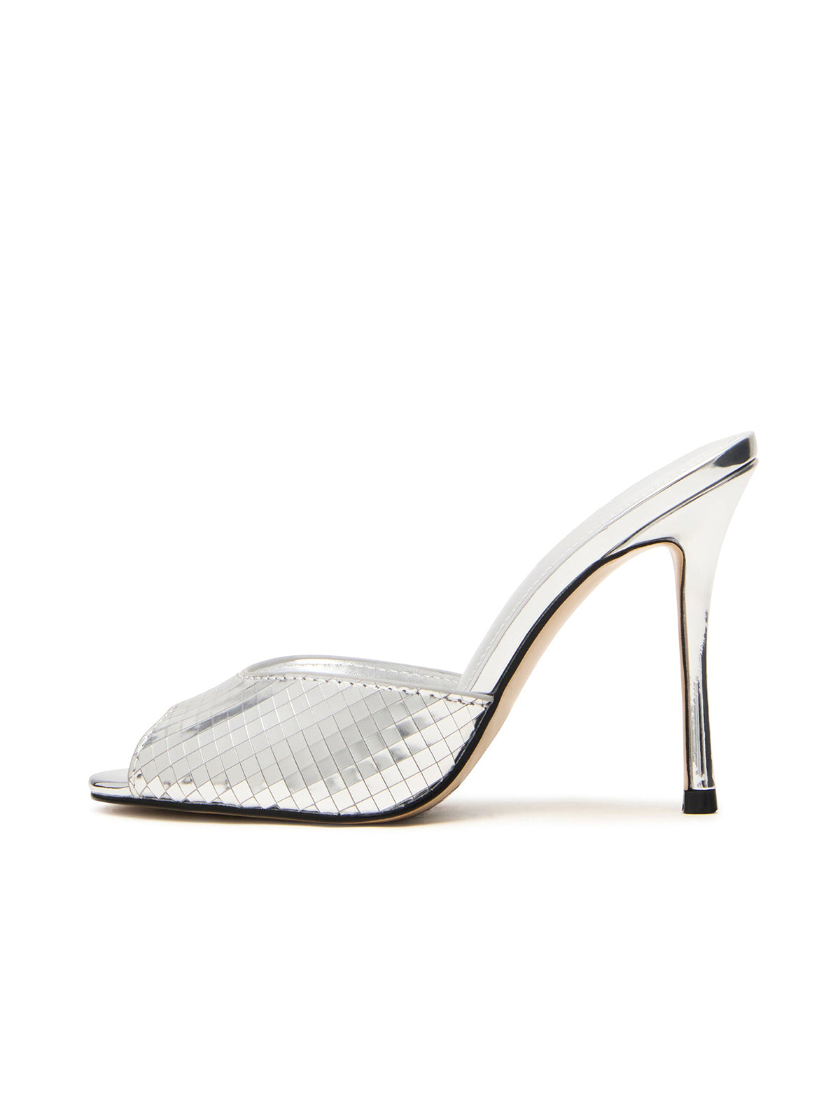 Впуснете се в непреходна елегантност с тези сребристи металически обувки на висок ток с отворен гръб и заоблен връх. Блестящото метално покритие улавя светлината с всяка стъпка, излъчвайки увереност и изтънченост. С елегантен дизайн без гръб и класически силует с отворен връх, тези обувки на ток предлагат перфектна комбинация от модерен блясък и семпла грация.