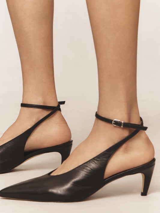 Black Pointed-Toe Chic Slingback And Buckle Ankle Strap Kitten Heels