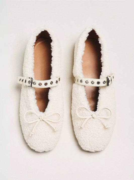 White Plush Square-Toe Front Bow Mary Jane Ballet Flats