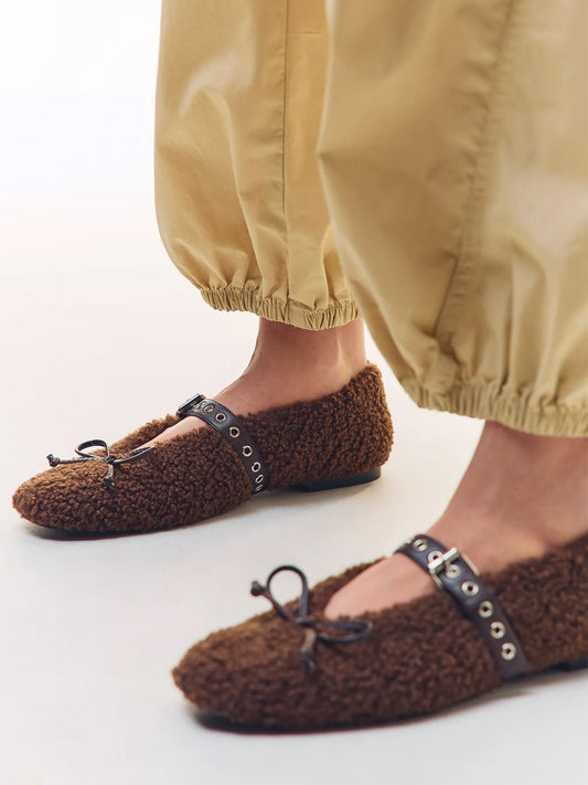 Chocolate Plush Square-Toe Front Bow Mary Jane Ballet Flats