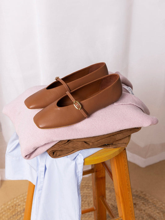 Caramel Square-Toe Buckle Mary Jane Ballet Classic Flats