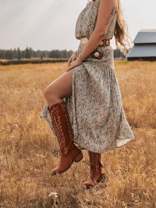 Full-Zip Almond-Toe Classic Embroidery Tall Knee High Cowgirl Boots - Green