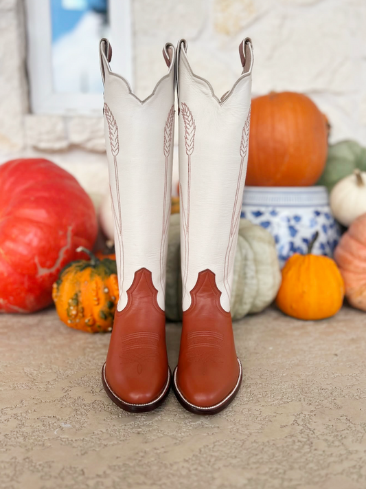 Contrast Ivory And Chestnut Almond-Toe Ear-Of-Rice Embroidery Wide Calf Knee High Cowgirl Boots