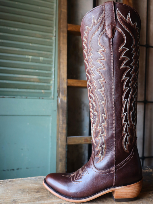Full-Zip Almond-Toe Classic Embroidery Tall Knee High Cowgirl Boots - Chocolate