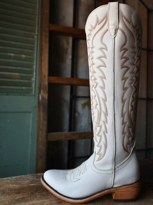 Full-Zip Almond-Toe Classic Embroidery Tall Knee High Cowgirl Boots - Ivory