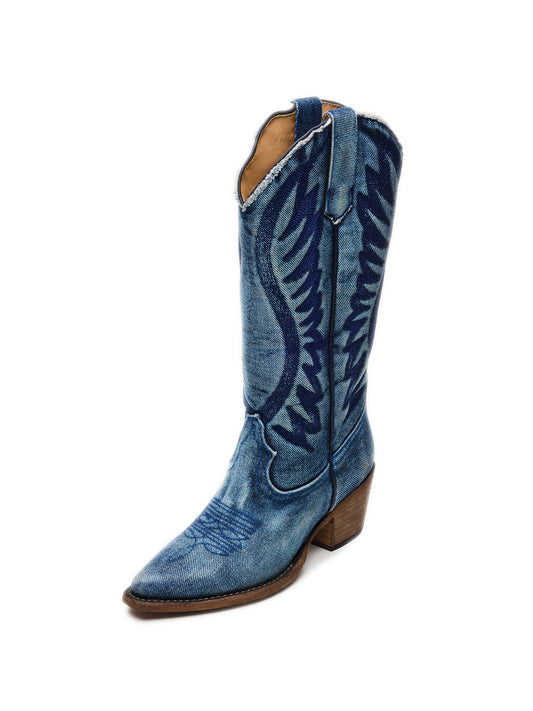 Blue Denim Pointed-Toe Wings Embroidery Mid Calf Cowgirl Boots