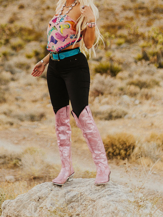 Metallic Crinkle Embroidery Pointed-Toe Half-Zip Over-The-Knee Cowgirl Boots - Rose Pink