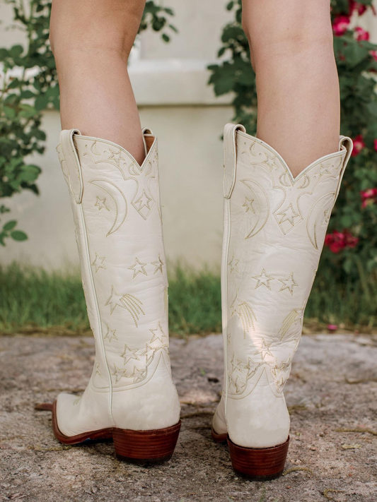 Moon Star Inlay Applique Wide Calf Knee High Cowgirl Tall Boots - Cream