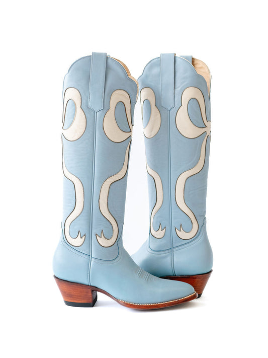Blue Almond-Toe Wide Calf Western Boots Knee High Tall Boots With White Bowknot Inlay