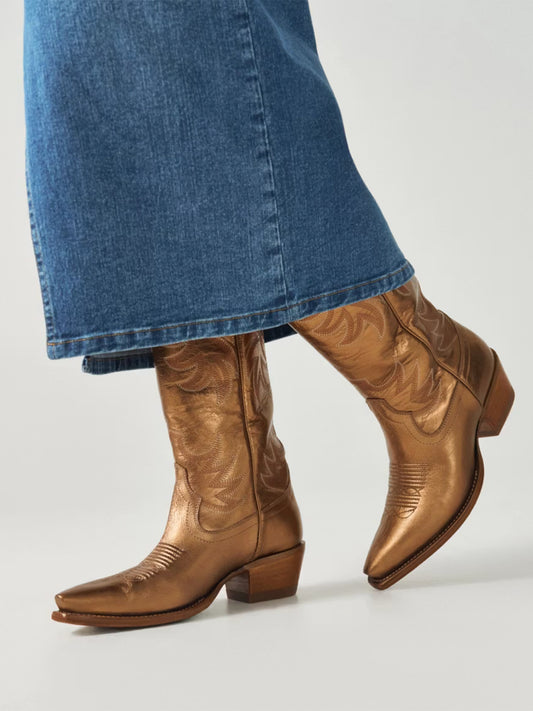 Metallic Copper Snip-Toe Embroidery Wide Calf Knee High Cowgirl Boots