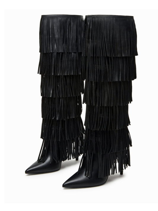 Black Pointed-Toe Fringe Wide Calf Tall Knee High Stiletto Boots