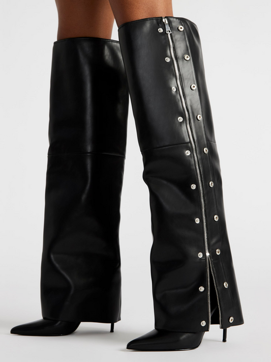 Black Pointed-Toe Studded Fold-Over Full-Zip Over-The-Knee Stiletto Boots