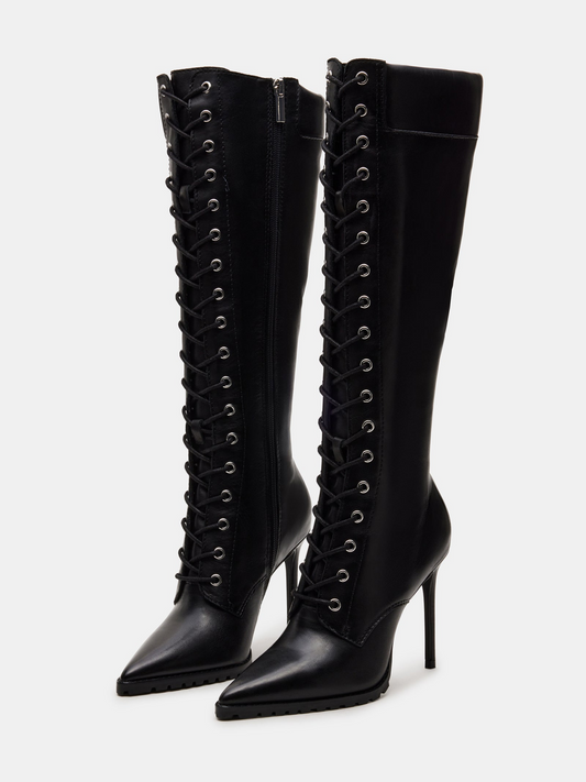 Black Pointed-Toe Lace-Up Full-Zip Mid Calf Stiletto Boots