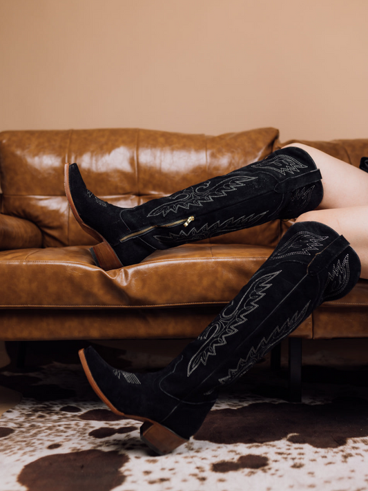 Eagle Embroidery Snip-Toe Half-Zip Over-The-Knee Tall Cowgirl Boots - Black Faux Suede