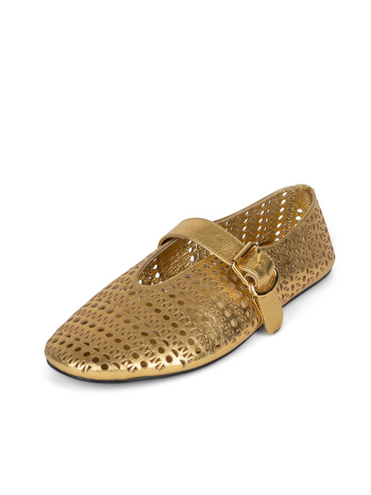 Metallic Gold Perforated Flats Cutout Mary Janes With Buckled Strap