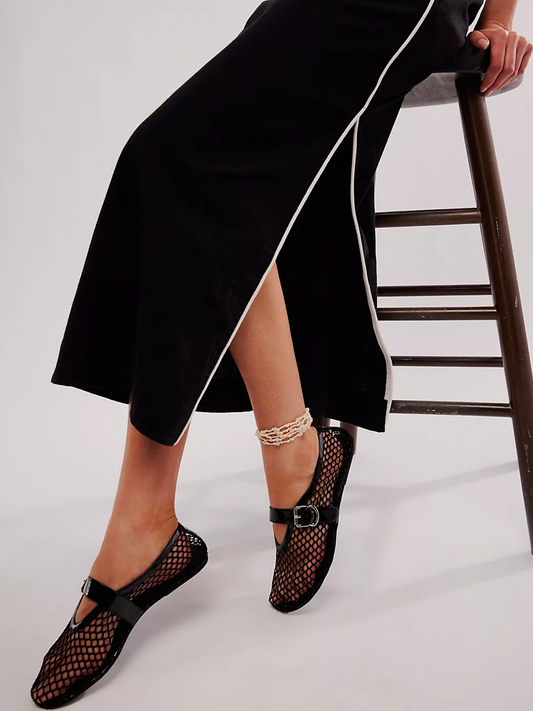 Black Fishnet Ballet Flats Mary Janes With Buckle Strap