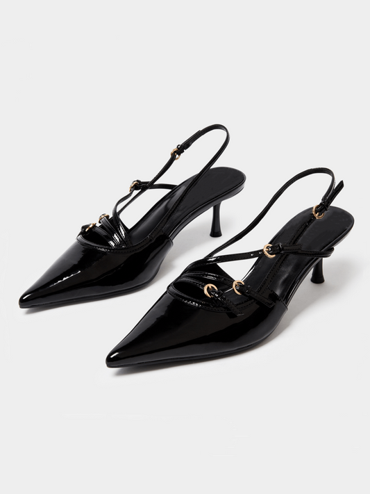Black Patent Strappy Pointy Kitten Heels Slingback Courts Pumps