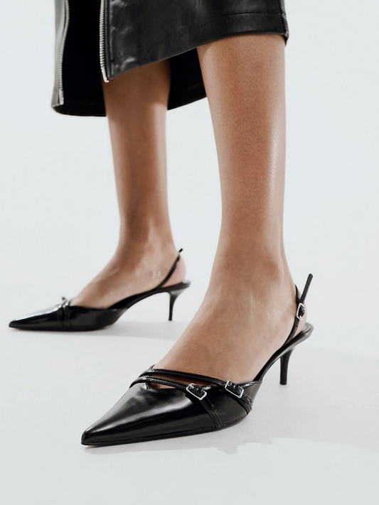 Black Buckled Strappy Pointy Kitten Heels Slingback Courts Pumps