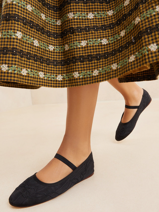 Black Bow Embroidered Fabric Ballet Flats Mary Janes