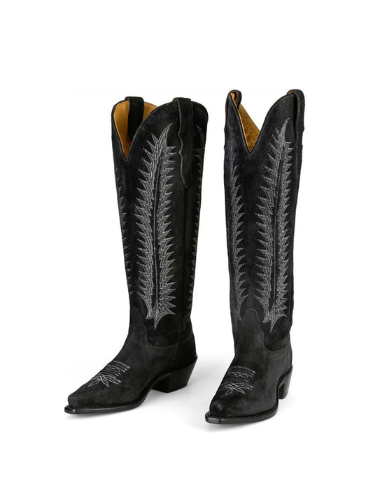 Black Faux Suede Snip-Toe Wide Calf Embroidery Knee High Cowgirl Boots