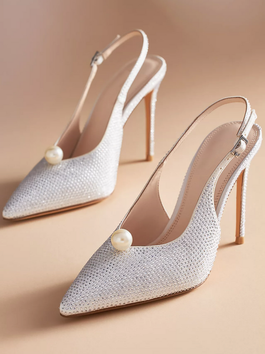White Satin Rhinestone Pointed-Toe Slingback Pump High Heels With Pearl