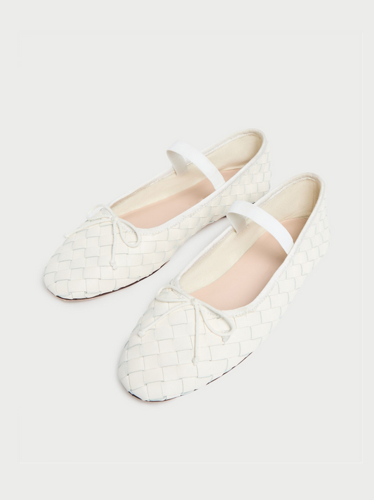 White Woven Bow Round-Toe Ballerina Flats Mary Janes With Elastic Band