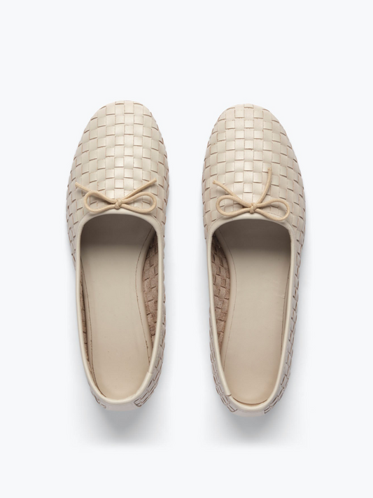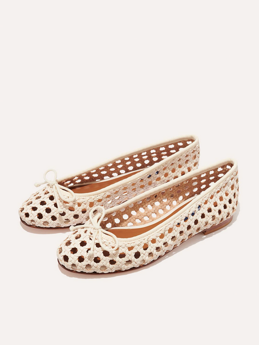 White Woven Bow Hollow-Out Round-Toe Slip-On Ballet Flats